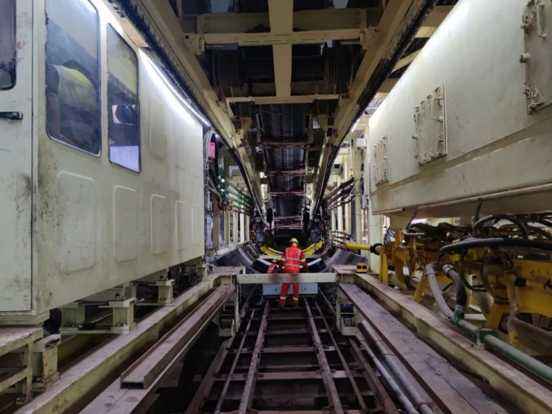 由于紧邻解放碑、时代天街等商业区和居民区,线路施工场地狭小,可谓捉襟见肘。在重庆轨道集团的统筹安排下,施工单位中国交建积极践行集约穿透式管理理念,从右线负环拆除、左线TBM步进装机调试、现场始发准备等各方面制定计划倒排节点,通过定人、定责、定节点的“三定”模式将原本复杂交错的施工工序清单化,“螺蛳壳里做道场”,顺利完成TBM始发工作。