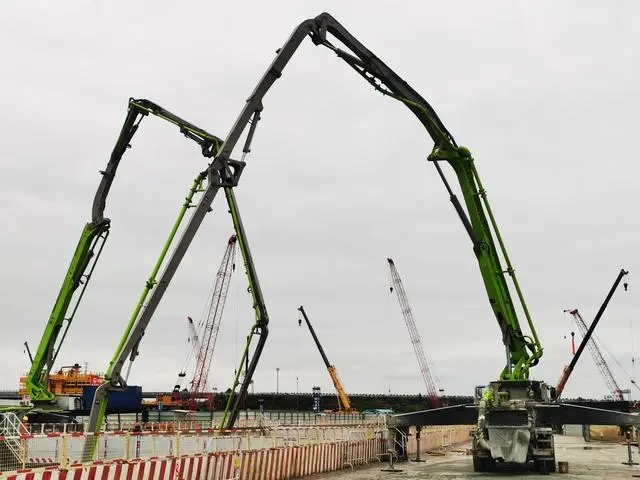 T3轨道交通枢纽广珠(澳)区间明挖段基坑长346米,宽16.6米,深20米,顶板厚度为1米。本次完成浇筑的顶板长54米,一次性浇筑混凝土方量约1417立方米,浇筑厚度1米,采用两台天泵同时作业,每小时浇筑量约45立方米,连续16小时完成。