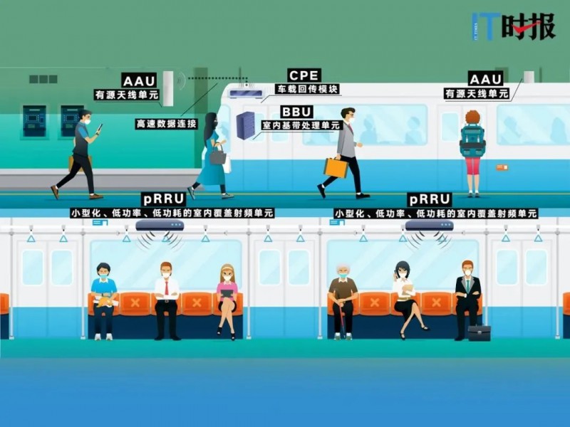 “设备上车”,具体来说,在车头和车尾的顶部安装CPE(车载回传模块),同时在第一节车厢内安装1台BBU(室内基带处理单元)设备,在每节车厢内都安装1台pRRU(小型化、低功率、低功耗的室内覆盖射频单元)。