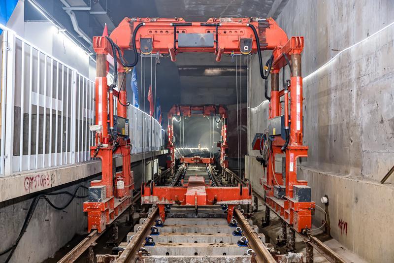 五号线东延段轨道工程共铺设轨道约28.7公里,铺设单开道岔31组。施工过程中,由于感应板对轨枕间距要求高,广州地铁及施工单位中铁三局的建设者们在短轨铺设过程中设计了新型的卡具,严格控制每根轨枕间距,为后期感应板高效率、高质量安装提供条件。同时,全线共设置七处联络通道临时过渡,建设者们每天对临时线路进行监测,保证临时线路行车安全。