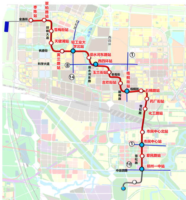 拟建设郑州市低运量轨道交通T3线一期工程(最终方案以有关部门批复为准)位于郑州市高新区及中原区,线路北起于高新区金盏街,主要沿创新大道、枫香街、须水河东路、科学大道、西四环、冬青街、腊梅路、梧桐街、雪松路高架敷设,终点位于中原区郑州一中西侧,线路全长约16km,共设车站18座,平均站间距约910m,其中换乘站5座,本工程线路最高设计速度80km/h。