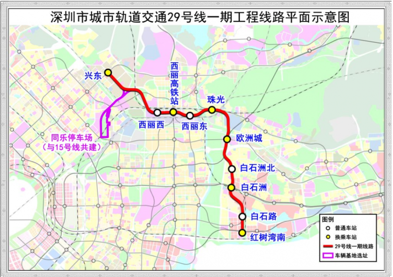 深圳市城市轨道交通29号线一期工程起于红树湾南站、止于兴东站,是强化西丽枢纽集疏运体系,支持深圳湾超级总部、西丽高铁新城等重点片区发展的普速线路。线路主要沿深湾公园路、沙河街、沙河东路、龙珠大道、站北路、留仙二路敷设。本工程全长约11.3km,全地下敷设,设站10 座,其中换乘站6 座,最大站间距约2.84km(西丽西站至兴东站),最小站间距约0.74km(红树湾南站至白石路站),平均站间距约1.2km。一期工程设同乐停车场一座,与15号线同乐车辆段同址共建,出入线分别于兴东站站前、西丽西至兴东区间接出。