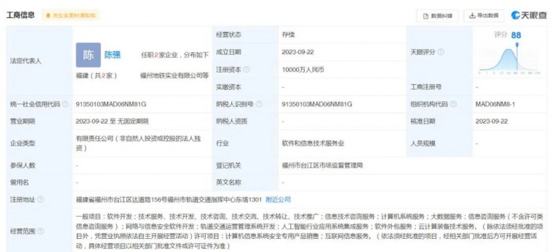 9月22日,福州地铁科技有限公司注册成立。注册资本10000万元。