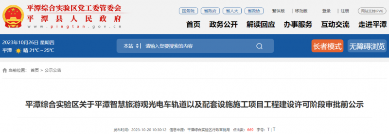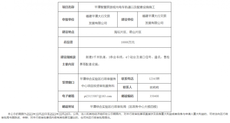 10月20日,福建省福州市平潭县人民政府官网发布平潭综合实验区关于平潭智慧旅游观光电车轨道以及配套设施施工项目工程建设许可阶段审批前公示。根据公示,该工程总投资1亿元。建设规模及主要内容:新建8千米轨道、3条会车线、4个站台及道口信号、通讯、售检票等配套设施。