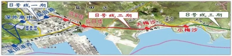 8号线二期工程(盐田路站(不含)至小梅沙站)线路全长8.013km,时速80km/h,设鸿安围站、盐田墟站、大梅沙站、小梅沙站4站4区间。因其穿山跨海的路线特征,被誉为“山海专列”。