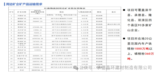 项目所在地运输需求高度集中,20公里范围内年产铁精粉1000万吨、磷精粉360万吨以上。项目可覆盖滦平县、承德县、隆化县、双滦区四个县区90多家矿山企业。