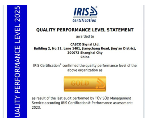 卡斯柯对安全质量坚持严苛要求,是业内成立独立的系统安全部、将质量和安全分立管理的首家企业。从2013年首次通过IRIS认证,到2022年获得银级绩效认定,再到此次问鼎金级绩效认证,十余年不懈努力,实现了质量管理体系的持续升级。