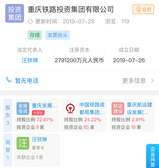 通过查询企业信息显示,重庆铁路投资集团成立于今年7月26日,注册资本2791200万元。企业注册地在重庆市江北区金融街。法定代表人为汪钦琳。据了解,汪钦琳此前担任重庆市交通局副局长,目前担任重庆铁路投资集团董事长一职。