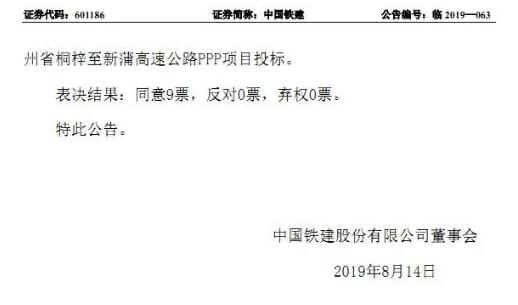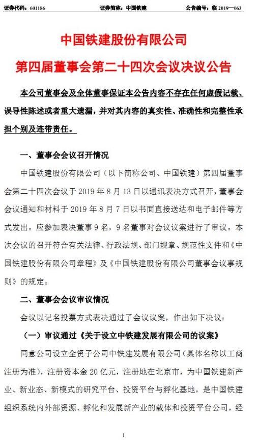 铁建股份有限公司公告称第四届董事会第二十四次会议于 2019 年 8 月 13 日以通讯表决方式召开,作出如下决议: