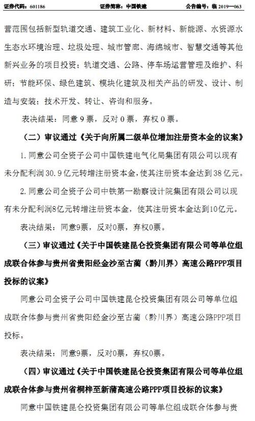 1.同意公司全资子公司铁建电气化局集团有限公司以现有未分配利润30.9亿元转增注册资本金,使其注册资本金达到38亿元。