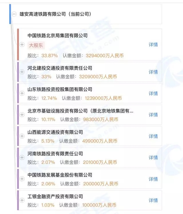 天眼查信息显示,雄安高速铁路有限公司目前有8个股东,最大股东为铁路北京局集团有限公司,持股比例为33.87%,河北建投交通投资有限责任公司、山东铁路投资控股集团有限公司、北京市基础设施投资有限公司(原北京地铁集团有限责任公司)、山西能源交通投资有限公司、河南铁路投资有限责任公司、铁路发展基金股份有限公司、工银金融资产投资有限公司也在股东之列。